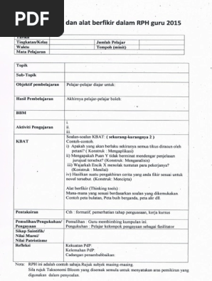 Contoh Penulisan Rph Kbat Pdf 60 minit Teori Amali. Contoh aktiviti KBAT yang dilaksanakan di dalam bilik darjah Kemahiran Berfikir Aras Tinggi KBAT dan Pelaksanaan KBAT di Sekolah. KOLEKSI KUIZ 3756-1 PERCUBAAN SPM 2020.